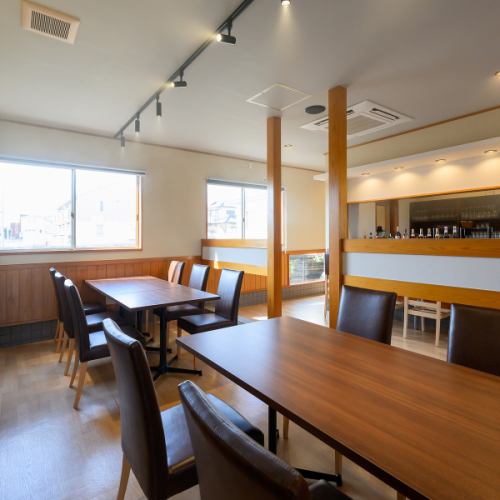 窓側のテーブル席は自然光が差し込む明るい空間で、ランチはより開放的に、ディナーは落ち着いた雰囲気で過ごせる特等席。記念日やデート、ゆっくり食事を楽しみたい方にもおすすめで、料理と景色が調和する特別感ある時間を演出します。